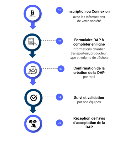 👉 ETAPE 2 : Formulaire DAP à compléter en ligne avec les informations sur votre chantier, le transporteur, le producteur, le type et le volume de déchets